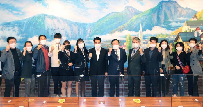 | ▲백군기 용인시장이 덕영고등학교 학생들과 기념촬영을 하고 있는 모습. 용인시 제공 |