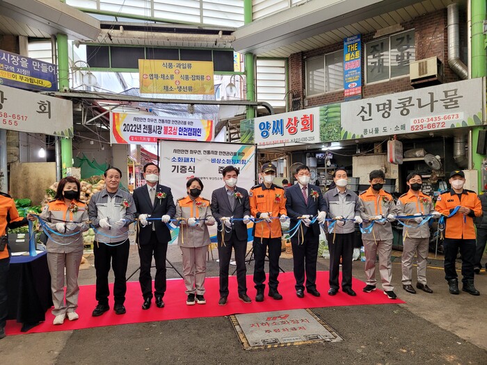 이날 캠페인은 부산진구청장, 박희용 시의원, 부산진구의장, 8대시장 회장단을 비롯해 약 70여명의 인원이 참석한 가운데 ▲비상소화패치 기증식 ▲비상소화장치 준공식 ▲의용소방대와 함께하는 화재예방 홍보캠페인 ▲시장 내 소방차량 출동로 확보 훈련 순으로 진행됐다.
