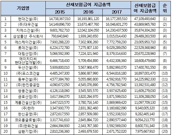 현대건설이 471억원으로 불명예 1위를 차지했다. 이어 산재 사망자가 가장 많이 발생한 건설사인 대우건설이 439억원으로 2위, GS건설(359억원), 삼성물산(295억원), SK건설(230억원), 롯데건설(225억원), 대림산업(207억원), 현대산업개발(186억원), 두산건설(174억원), 포스코건설(169억원)이 뒤를 이었다.
