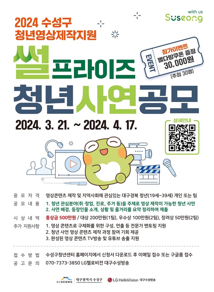 [로컬세계=박세환 기자] 대구 수성구는 청년영상 제작지원 ‘썰프라이즈’ 청년 사연 공모전을 열어 재미있고 유쾌한 사연을 발굴한다고 21일 밝혔다.