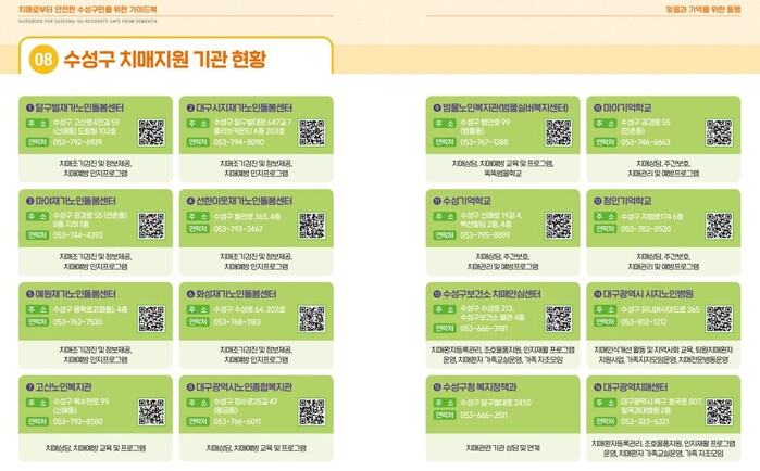수성구는 가이드북을 누구나 쉽게 열람할 수 있도록 지역 노인복지시설, 종합사회복지관, 동 행정복지센터, 보건소 등 관련 기관에 배포하고 수성구청 홈페이지에도 게시할 예정이다.