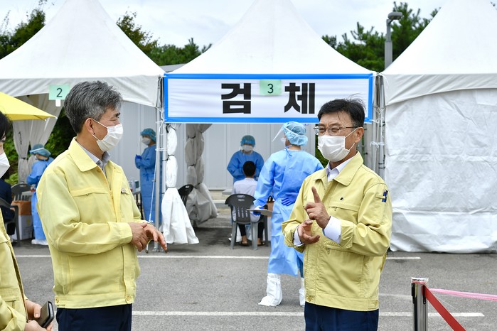 | ▲정하영 시장(오른쪽)이 1일 월곶공영차고니 코로나19 임시선별검사고를 방문해 상황을 점검하고 있다. 김포시 제공 |