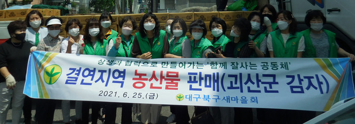 [로컬세계 박세환 기자]대구북구새마을회(회장 정연식)는 북구새마을부녀회(회장 양미경) 주관으로 25일 대구 북구와 자매도시인 충북 괴산군에서 생산한 감자 480박스(1박스 10kg)를 판매했다.
