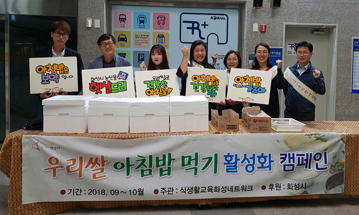 이날 식생활교육화성네트워크 소속 강사들은 출근길 시민 300여 명에게 아침밥 먹기의 필요성과 레시피가 든 안내책자, 주먹밥, 요구르트 등을 전달하며 지역에서 만드는 쌀 ‘햇살드리’를 알렸다.
