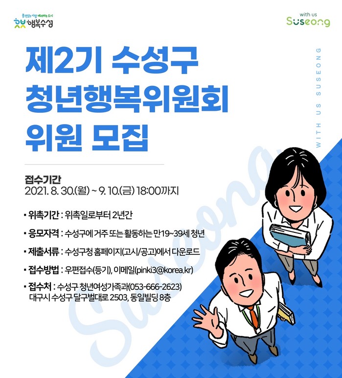 [로컬세계 박세환 기자]대구 수성구는 오는 9월 10일까지 제2기 청년행복위원회 청년위원을 8명 공개 모집한다고 31일 밝혔다.