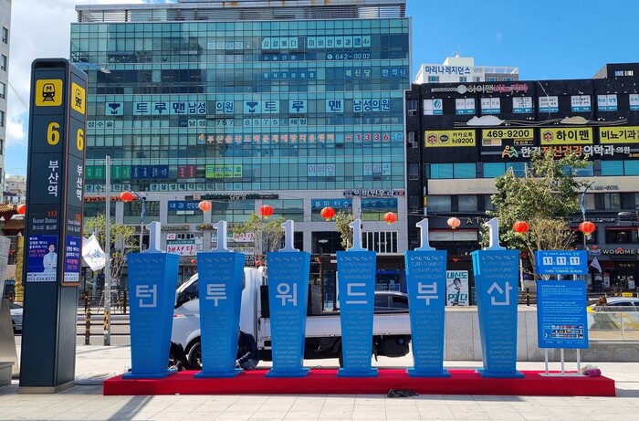 부산을 향해 묵념하는 11일 11시를 의미하는 ‘111111’을 형상화 한 평화의 빛 조형물을 부산역 광장(도시철도 부산역 6번 출구)에 설치하고, 매일 18시부터 다음날 5시까지 점등한다. 또한, 이동형 LED 차량을 이용하여 유동 인구가 많은 부산 지역 30개 거점 지역에 순환 정차하며 턴투워드 부산 홍보 영상 등을 송출한다.