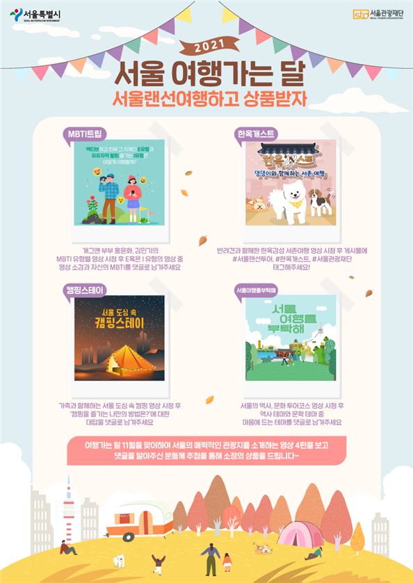 특히, 요즘 MZ세대가 주목하는 MBTI(성격유형검사), 반려동물, 캠핑 등 흥미로운 소재로 서울의 인기 장소와 문화, 즐길거리 등을 소개하고 있어 서울의 매력과 가치를 충분히 재발견할 것으로 기대된다.
