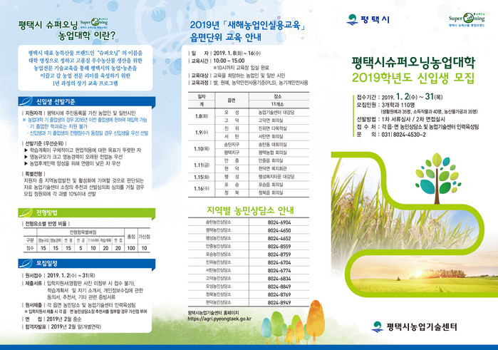 모집과 관련 자세한 사항은 가까운 읍·면 농민상담소 또는 농업기술센터 인력육성팀(031-8024-4530~2)으로 문의하거나, 평택시농업기술센터 홈페이지에서 확인할 수 있다.