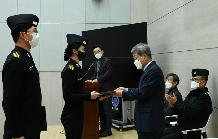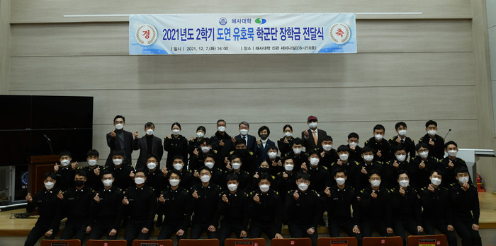 [로컬세계 맹화찬 기자]한국해양대학교 해사대학(학장 김유택)은 7일 해사대학 신관 세미나실에서 ‘2021년 2학기 도연 유호묵 학군단 장학금 전달식’을 열고 56명의 학군단 학생들에게 장학금을 전달했다.