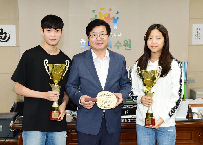 [로컬세계 고용주 기자]염태영 수원시장이 2019 체코오픈국제탁구에서 혼합복식 우승을 차지한 신유빈(15, 수원 청명중)·조대성(16, 서울 대광고) 선수를 24일 집무실로 초청해 격려했다.