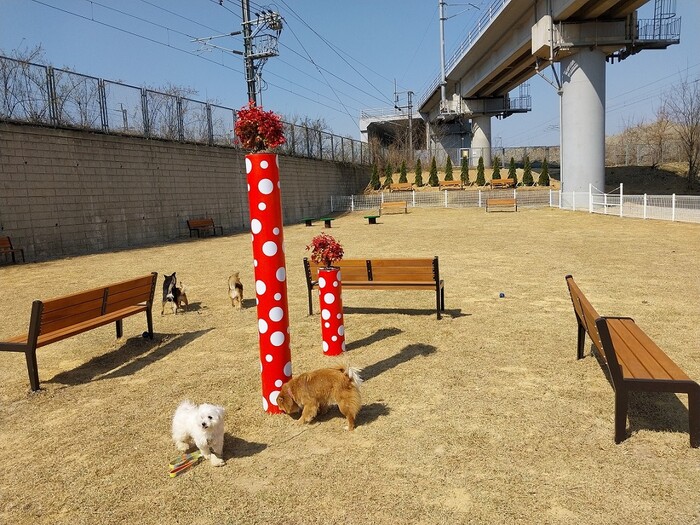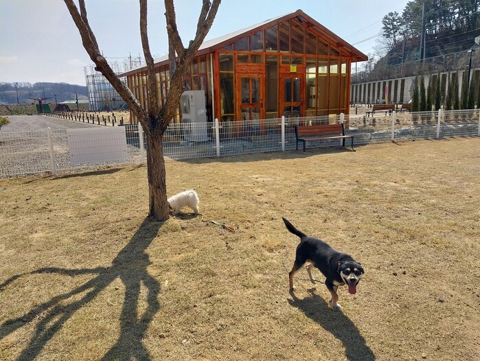 넓은 잔디밭에서 반려견이 자유롭게 뛰어놀 수 있도록 외곽펜스를 설치하고, 반려견과 견주가 교감을 나눌 수 있게 통나무계단을 비롯한 놀이기구 3점도 마련했다.