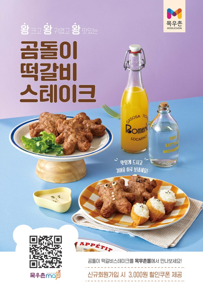 '곰돌이 떡갈비스테이크'는 돼지고기의 갈빗살·뒷다리살과 양파, 대파 등 엄선된 국산 재료를 사용했으며, 목우촌만의 특제 떡갈비 양념으로 은은한 숯불향과 달콤하면서 짭짤한 맛이 가미되었다. 특히 귀여운 곰돌이 형태의 모양은 먹는 즐거움과 함께 보는 즐거움도 선사한다.