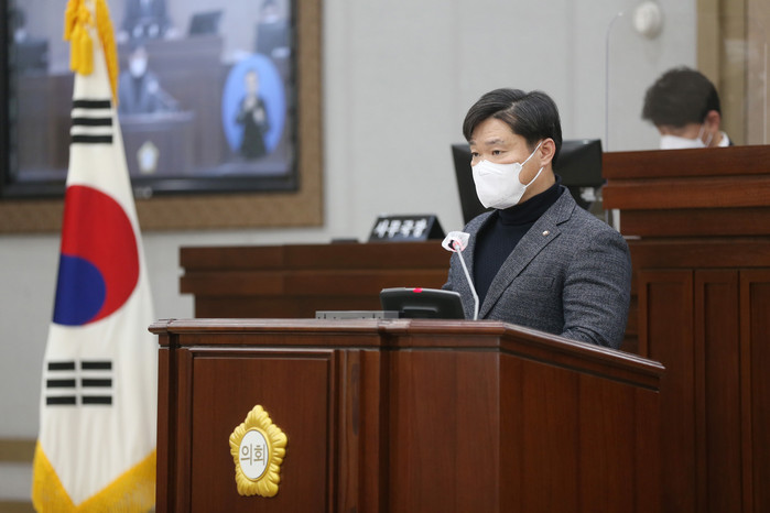 ▲수원시의회 최찬민 더불어민주당 대표, 제364회 임시회에서 연설 나서. 수원시의회 제공 |