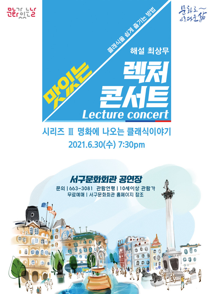 서구문화회관에서는 2021년 오픈 문화강좌로 4월부터 7월까지‘맛있는 렉처콘서트’를 개최하여 해설과 영상, 공연을 통해 클래식을 보다 쉽게 감상하는 시간을 갖는다.