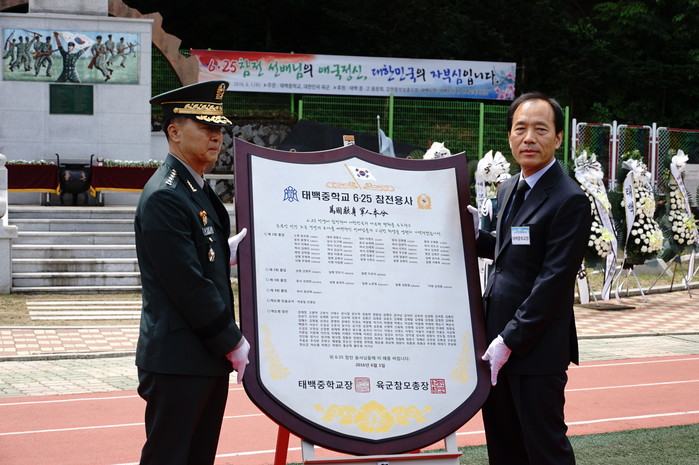 특히 이날 행사에서는 학도병 127명과 태백중학교 출신 6.25참전자 43명 등 170명의 군번과 이름이 새겨진 명패를 장준규 육군 참모총장이 참석해 직접 학교에 증정했다.