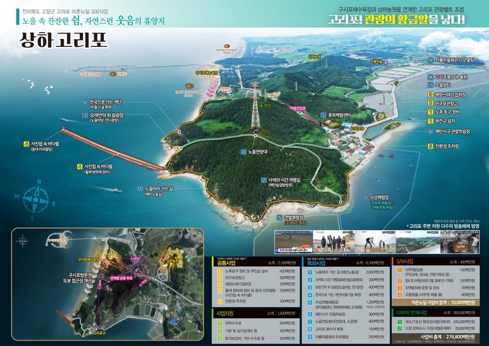 이번 고리포 어촌뉴딜의 주제는 ‘노을 속 잔잔한 쉼, 자연스런 웃음의 휴양지’로 정해졌다. 2023년까지 국비 등 약 100억원을 투자해 해안노을길, 노을전망대, 갯벌체험장, 수상레저체험장(무동력패들보드, 뗏목체험) 등이 만들어진다.