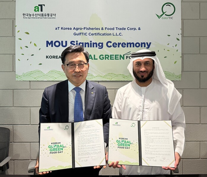 한국농수산식품유통공사(사장 김춘진)는 두바이 현지시간 14일 아랍에미리트(UAE) 글로벌 인증 전문 기관인 걸프틱(GulfTIC)과 할랄인증 자문 등 중동 지역 K-푸드 수출 확대와 저탄소 식생활 문화 확산을 위한 업무협약을 체결했다.