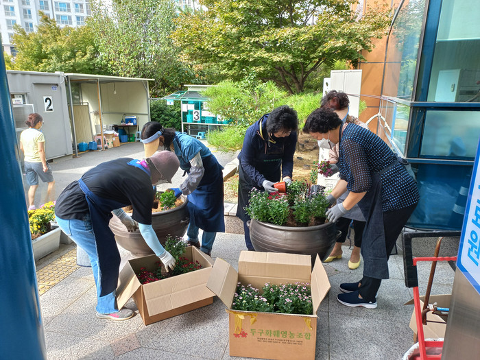 [로컬세계 부산 = 손영욱 기자]부산 해운대 도시농업 공동체인 도시농부 네트워크는 지난 8일 해운대구보건소 내 코로나19 선별진료소에서 국화 심기 재능기부 활동을 펼쳤다고 12일 밝혔다.