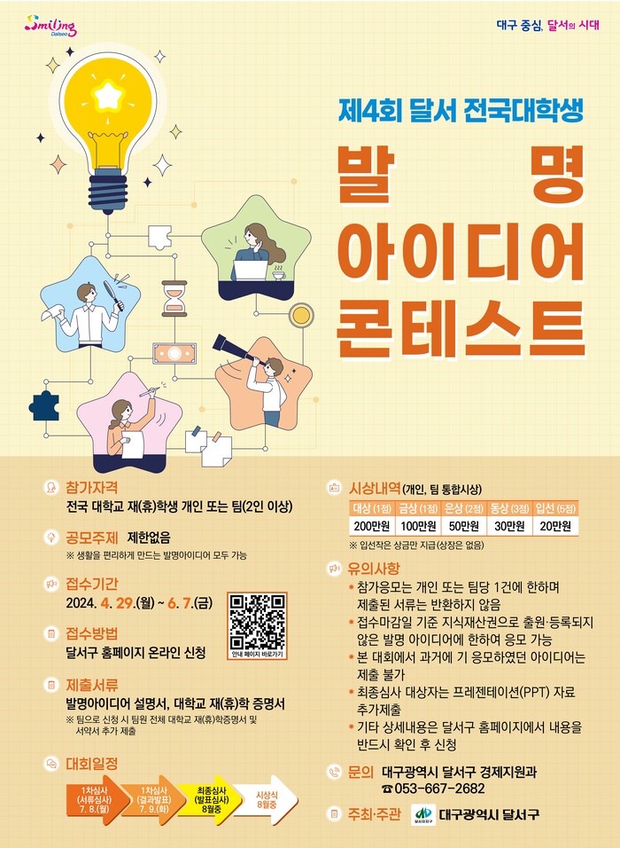 [로컬세계=박세환 기자] 대구 달서구가 오는 29일부터 6월 7일까지 '제4회 달서 전국대학생 발명아이디어 콘테스트'를 통해 대학생들의 톡톡 튀는 발명아이디어를 접수한다.