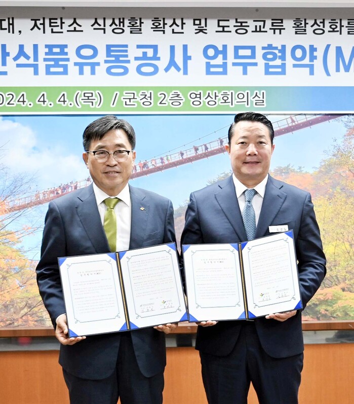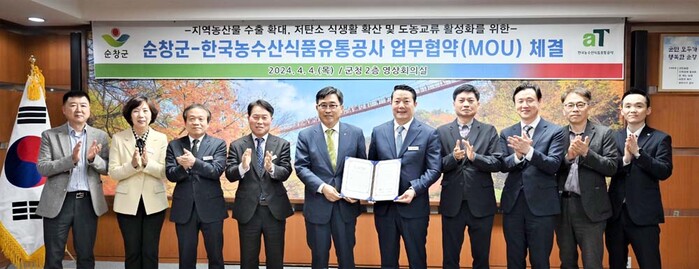 한국농수산식품유통공사(사장 김춘진)와 순창군(시장 최영일)은 4일 순창군 농업기술센터에서 K-푸드 수출 진흥과 저탄소 식생활 확산을 위한 업무협약을 체결했다.