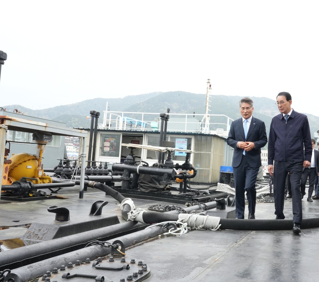 노동진 수협중앙회장(사진 왼쪽부터)과 정도근 삼천포수협 조합장은 지난 17일 삼천포수협 급유부선(바지선)을 방문해 봄철 갑오징어 등 조업기를 맞은 어업인들이 유가 상승으로 인해 조업을 포기하는 사례가 없는지 살피고 면세유 수급 현황을 집중 점검했다.
