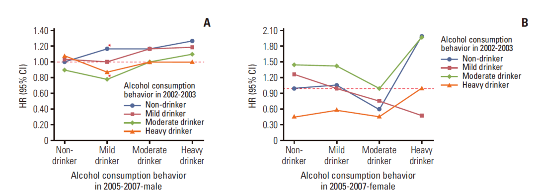 남성은 금주-절주-유지-증가에 따라 위암 위험이 순차적으로 증가하며 일관적 결과를 보인다.