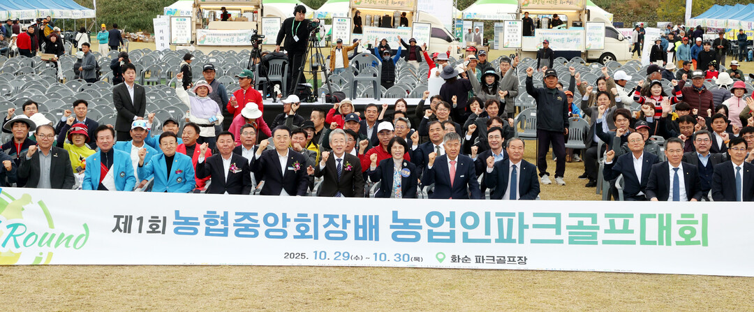 10월 30일 전남 화순 파크골프장에서 열린 '제1회 농협중앙회장배 농업인 파크골프대회' 결승전 시상식에서 참석자 등 화이팅을 외치며 기념촬영을 하고 있다. 농협 제공