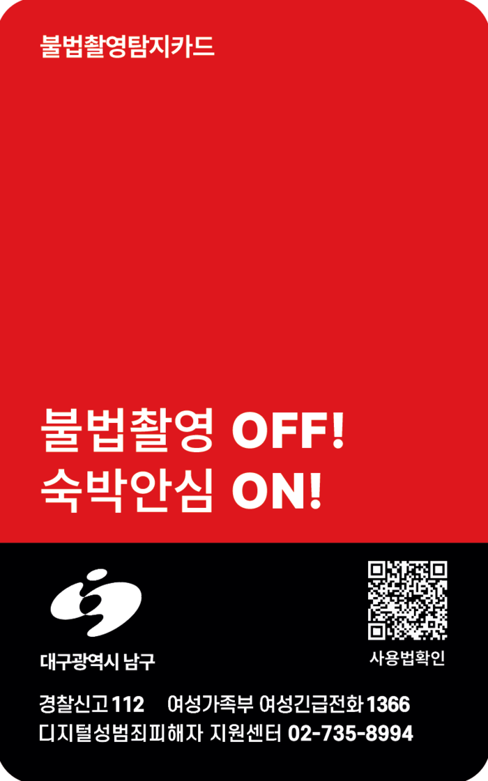[로컬세계=박세환 기자] 대구 남구는 안전하고 안심할 수 있는 남구의 숙박환경 조성을 위해 숙박업소 대상으로 휴대전화를 활용해 불법 촬영 카메라를 찾아낼 수 있는 불법 촬영 탐지 카드를 제작·배포해 불법 촬영 근절에 나선다.