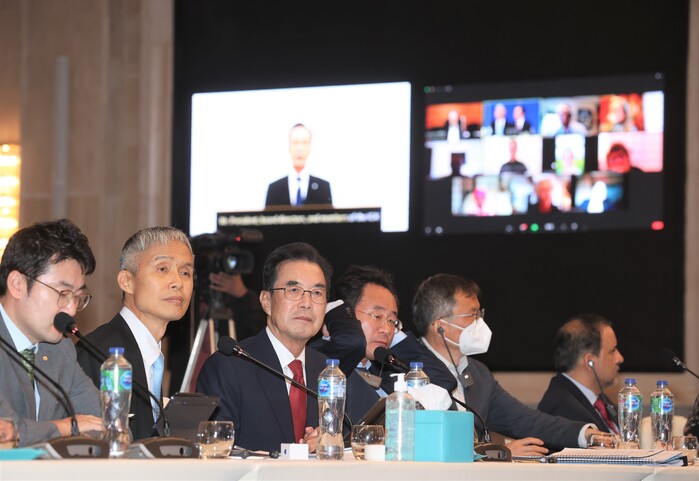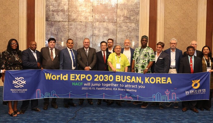 ▲ 이성희 농협중앙회장(왼쪽에서 3번째)이 현지시간 15일 이집트 카이로에서 열린 국제협동조합연맹(ICA) 이사회에서 2030 부산 세계박람회 유치를 홍보하는 영상을 상영하고 ICA 회원기관들의 지지를 요청하였다. |