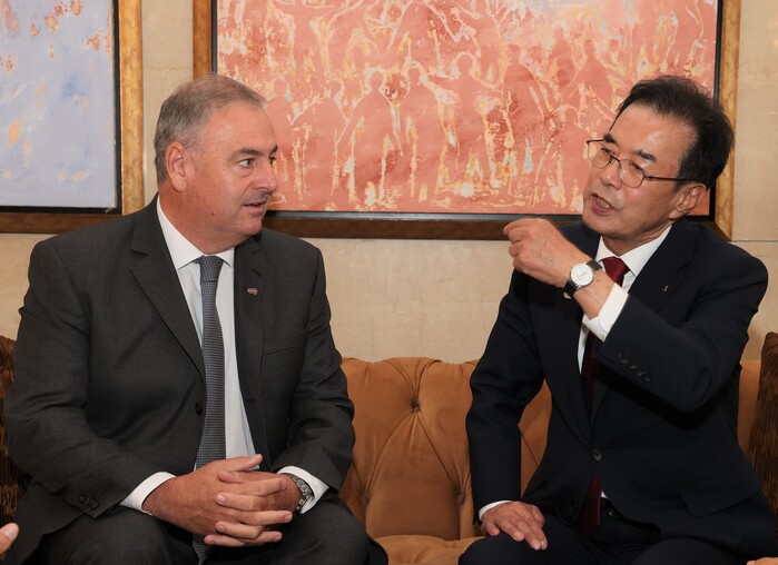 ▲ 이성희 농협중앙회장(오른쪽)이 현지시간 15일 이집트 카이로에서 열린 국제협동조합연맹(ICA) 이사회에 참석한 후 아리엘 구아르코 ICA회장을 만난 자리에서 2030 부산 세계박람회 유치를 홍보하며 지원과 협조를 당부하였다. |