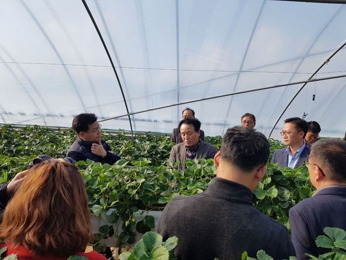 이날 김경규 청장은 김길환 충남농업기술원 기술보급과장, 장익희 논산시농업기술센터소장 등 관계자 10여 명과 함께 농업 현장을 방문해 딸기 농가의 의견과 애로사항을 청취하고 격려의 말을 전했다.