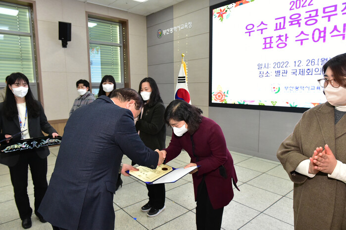 하윤수 교육감은 인사말을 통해 “지속된 코로나19 상황 속에서도 아이들의 안전하고 행복한 교육활동을 위해 최선을 다해 주시는 여러분들의 노고에 깊이 감사드린다”며 “오늘 수여식이 여러분들의 자긍심과 사명감을 제고하고, 부산교육 발전을 위해 교육공동체와 함께 노력하는 신바람 나는 학교 문화 조성에 큰 힘이 되길 바란다”라고 격려했다.