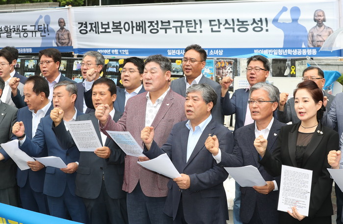 [로컬세계 고기훈 기자]송한준 경기도의회 의장(더민주, 안산1)과 전국 시·도의회 의장이 12일 주한 일본대사관 ‘평화비소녀상’ 앞에 집결해 우리나라에 대한 일본 정부의 백색국가 제외조치를 규탄하는 ‘아베정부의 내정간섭 및 경제침략 행위 철회촉구 성명서’를 발표했다.