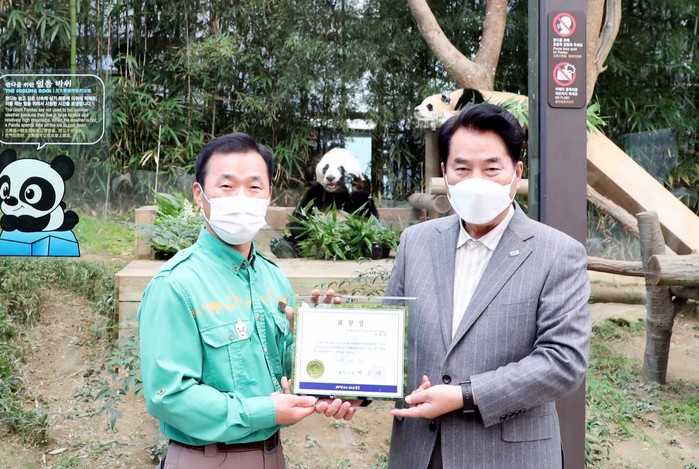 이와 함께 백 시장은 국내 최초로 멸종위기종인 자이언트 판다의 자연번식에 성공하고 판다의 성장에 노력해 국내외 관광객 유치에 기여한 강철원 삼성물산 사육사에게 관광진흥 유공 표창을 수여하고 감사 인사를 전했다.