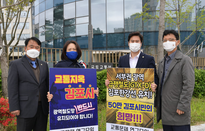 오강현 의원을 대표의원으로 박우식‧김옥균‧최명진 의원 참여하고 있는 연구모임은 지난 15일 김포공항역에서 광역철도 유치를 위한 피켓 홍보를 벌인데 이어, 16일 아침 세종시 국토교통부 청사를 찾아 ‘김포시 광역철도망 유치 촉구’피켓을 들고 김포시민의 유치 열망을 출근길 국토부 직원들에게 호소했다.