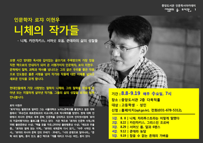 안성시립중앙도서관이 오는 8일부터 인문학자이자 서평가인 로쟈 이현우의 '니체의 작가들 : 니체, 카잔차키스, 서머싯 모옴, 쿤데라의 삶의 성찰들'을 주제로 야간 인문학 강연을 펼친다.