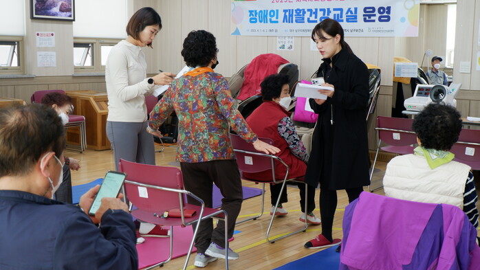 대구 남구보건소는 지역장애인보건의료센터로부터 재활전문강사를 초빙해 지난 7일부터 오는 6월 2일까지 뇌병변·지체장애인 10여명을 대상으로 맞춤형 재활운동 및 자가 건강관리교육을 8회 실시한다.