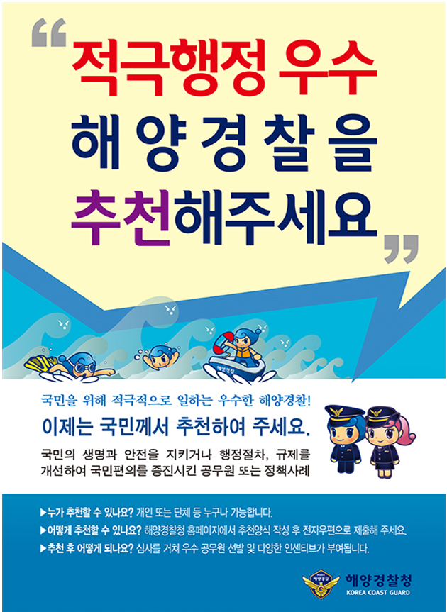 국민추천 방법은‘해양경찰청 홈페이지, 전자메일, 전화와 팩스 등 다양한 방법으로 국민이 편리하게 적극행정 우수사례와 공무원을 추천할 수 있다’고 밝혔다.