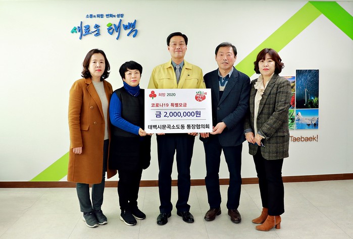 [로컬세계 박상진 기자]강원 태백시 문곡소도동 통장협의회(회장 임병수)가 13일 태백시에 코로나19 극복 성금 2백만 원을 기탁했다.