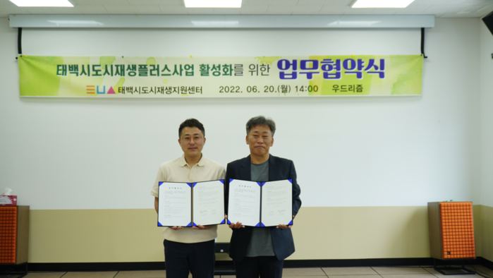 [로컬세계=박상진 기자]강원 태백시는 태백시 도시재생지원센터와 강원랜드 사내벤처 우드리즘이 지난 20일 태백시 탄탄나눔센터에서 도시재생 활성화 및 주민 역량강화를 위해 도시재생플러스사업 업무협약을 체결했다고 22일 밝혔다.