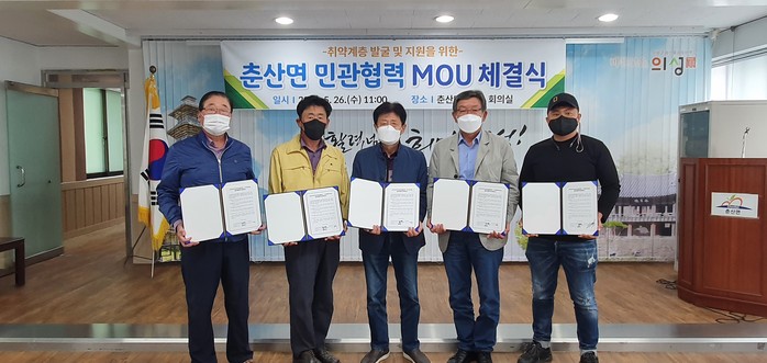 [로컬세계 박상진 기자]경북 의성군 춘산면 지역사회보장협의체는 지역 업체인 신일라이트닝, 의성부자농장, 수원건설, 창희건설과 지난 26일 춘산면사무소 2층 회의실에서 취약계층 발굴 및 지원을 위한 업무협약(MOU)을 체결했다고 28일 밝혔다.