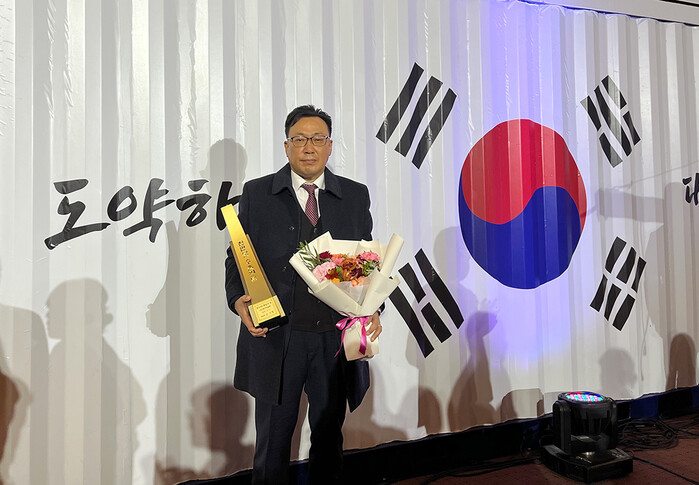 ▲레이저옵텍 이창진 대표가 무역의 날 기념식에서 1천만불 수출탑을 수상하고 있다. [사진= 레이저옵텍 제공] |