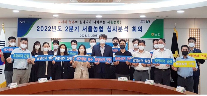 서울농협(본부장 황준구)은 공정하고 투명한 제3회 동시조합장선거를 위해, 22일 2분기 심사분석 회의 종료 후 공명선거 결의대회를 가졌다. 이날 회의에서는 공명선거 붐 확산을 위해 다양한 방안을 협의하고, 임직원들의 공명선거 실천, 선거중립 준수, 복무기강 확립을 다짐했다.