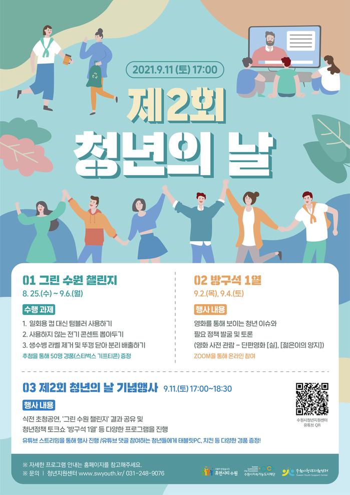 한편 수원시는 오는 9월 11일 오후 5시 수원시청년지원센터 유튜브 채널을 통해 ‘제2회 청년의 날(매년 9월 셋째 주 토요일) 기념행사’를 열고, ‘그린 수원 챌린지’ 결과 공유 및 청년정책 토크쇼 ‘방구석 1열’ 등 다양한 프로그램을 진행할 예정이다.