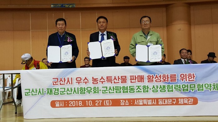 [로컬세계 양해수 기자]전북 군산시는 우수한 지역 농특산물의 판로를 확보하기 위해 27일 재경군산향우회 창립20주년 한마음대회가 진행된 서울동대문구체육관에서 재경군산향우회(회장 박성현) 및 군산팜협동조합(이사장 장병수)과 상생·협력을 위한 업무 협약을 체결했다.
