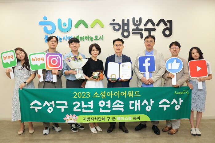 한편 수성구는 대한민국 SNS 대상에서도 2017년 ~ 2019년 3년 연속 최우수상 수상, 2020년 ~ 2021년 2년 연속 대상을 수상했다.