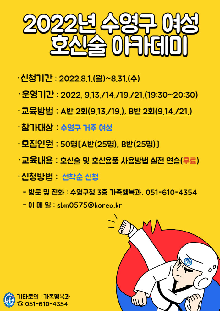 강성태 구청장은 “실전적인 호신술을 배울 수 있는 기회가 흔하지 않은 만큼, 연령에 상관없이 신청 가능한 이번 교육에 수영구 여성분들의 많은 참여를 기다리고 있다”라고 말했다.