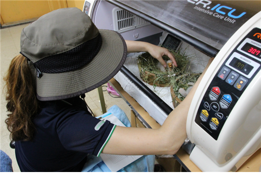 ▲현재 부모 저어새 개체의 인공포육장면(당시 2017년, 1주령) |