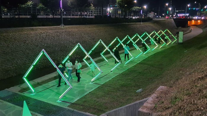 더불어 승두천 산책로 끝에서 만나는 서안성체육센터에 펼쳐지는 미디어파사드 또한 손꼽히는 볼거리 중 하나이다.(사진=안성시 제공)