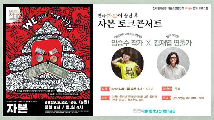 [로컬세계 김순복 기자]전태일기념관은 지난 5월 22일부터 26일까지 2층 울림터에서 총 5회에 걸쳐 개관초청공연작 연극 <자본>을 선보였다. 마지막 날인 26일에는 연계 프로그램으로 토크콘서트도 진행됐다.